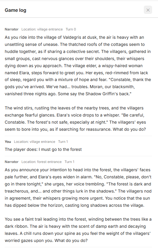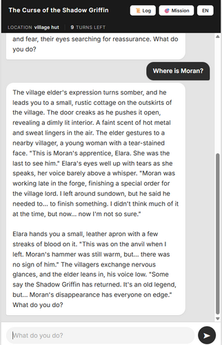 - The AI narrator processes your action and returns a response.