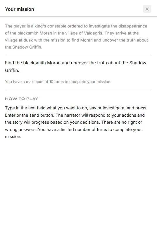 Hitzai is a turn-based narrative game played entirely through a chat interface. The player must achieve the story goal chating with the AI narrator who has the game rules, world, goals, etc. The player has a limited number of turns to complete the mission.